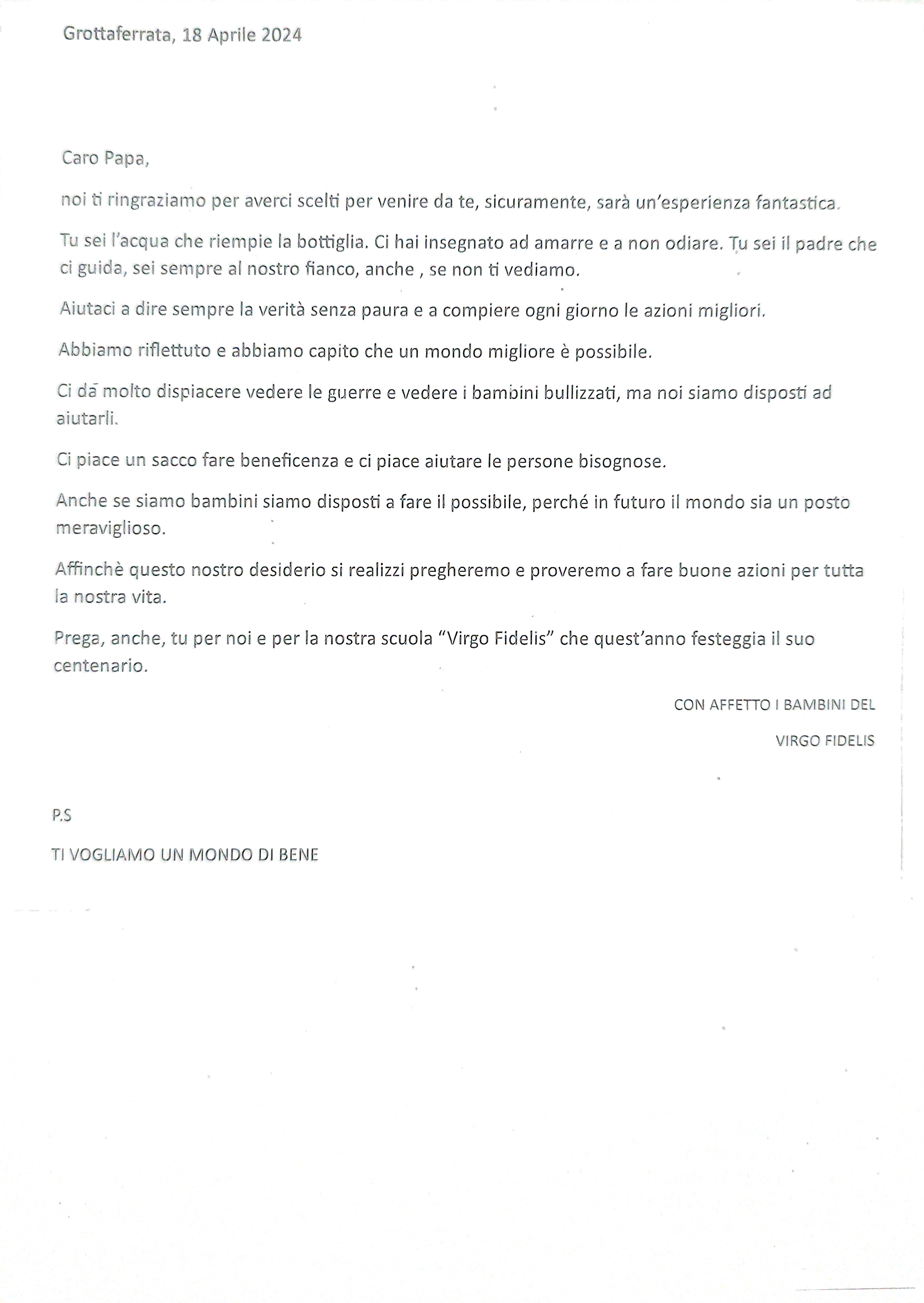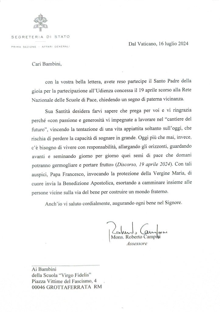 Certi di farvi cosa gradita, alleghiamo la foto del fiore, la lettera scritta dai bambini e quella di risposta del Papa.
