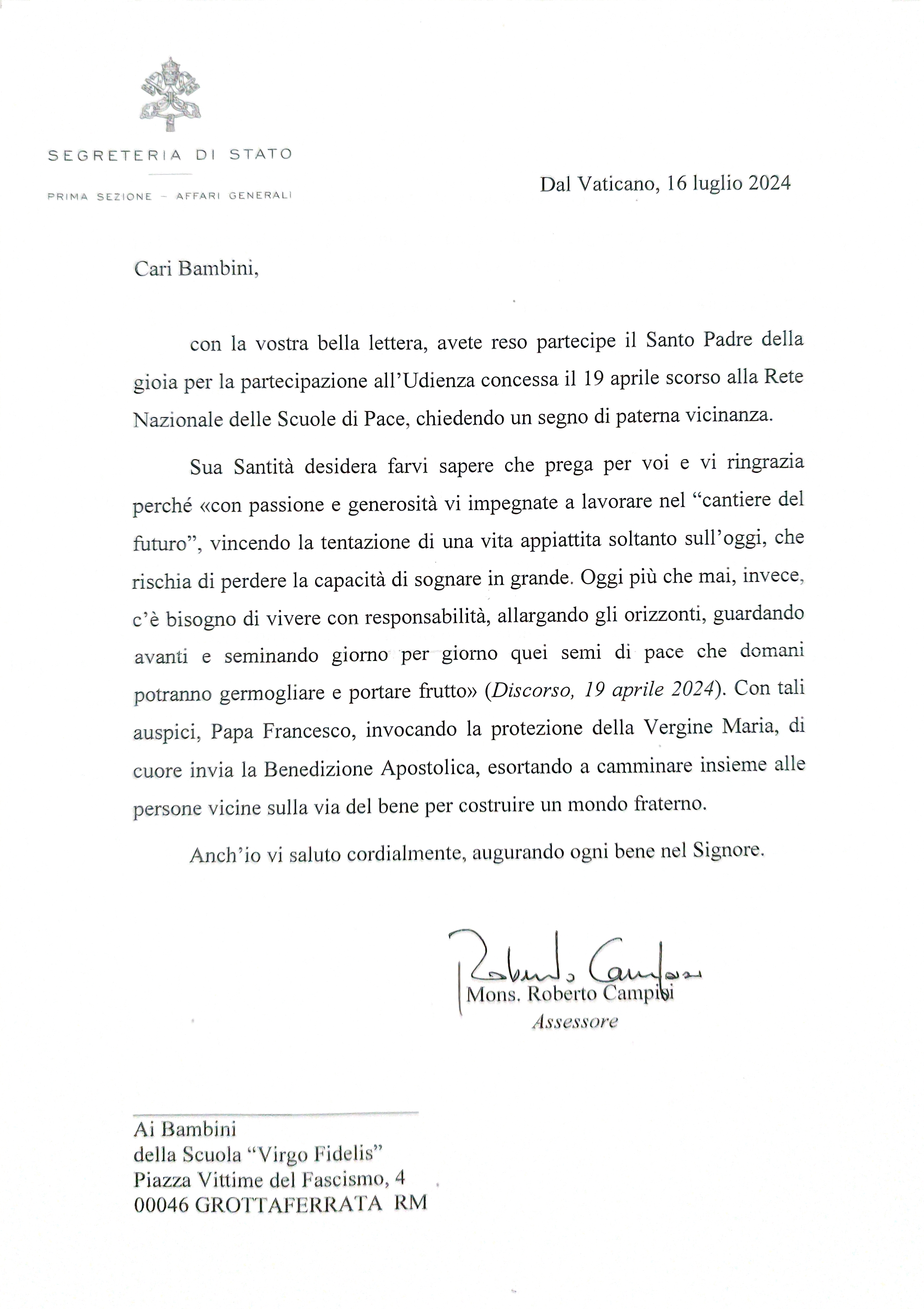 Con grande piacere, abbiamo in seguito ricevuto una lettera di risposta da Papa Francesco.